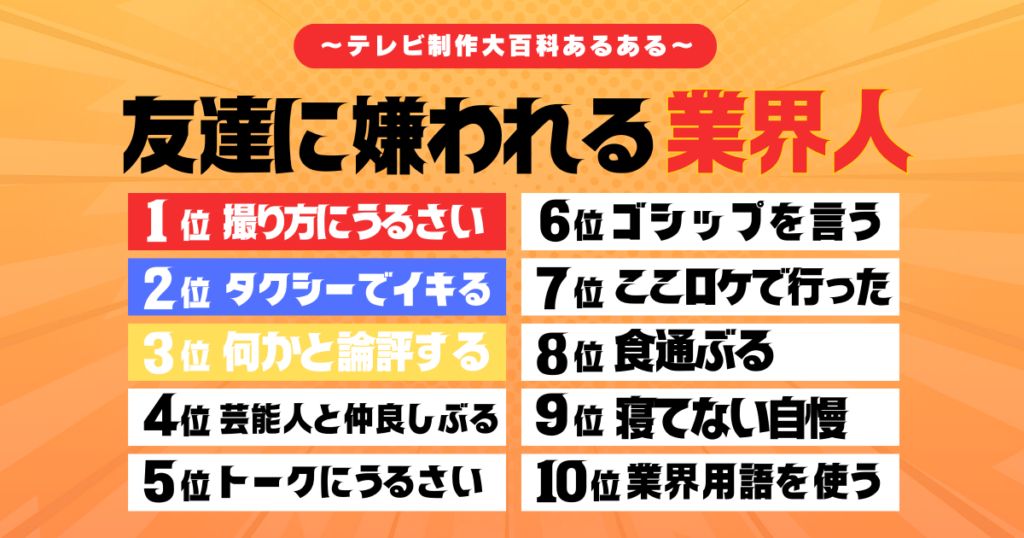 と友達や知り合いに嫌われてしまいがちな業界人の行動あるあるをランキング形式で発表します。